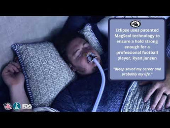 *Magnets used in the Eclipse™ are within ICNIRP guidelines for general public use. The magnetic strength is 65 mT. Ensure the mask is at least 0.8 inches (2 cm) away from any active medical implant or medical device (e.g., pacemaker, defibrillators, neurostimulators, cochlear implants, hearing aids), to avoid possible effects from localized magnetic fields. If you or a household member has magnets or metals in your bodies, consult a physician prior to use.