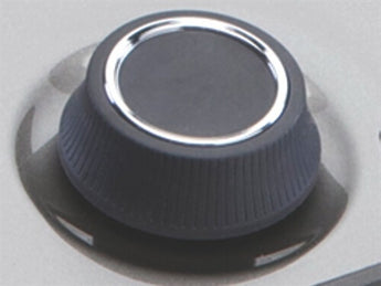 The PR System One 60 Series Knob is dark gray and features a silver inlay around the rim of the knob. The sides are flared out, and have soft ridges that offer users a good, comfortable grip.